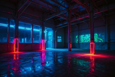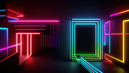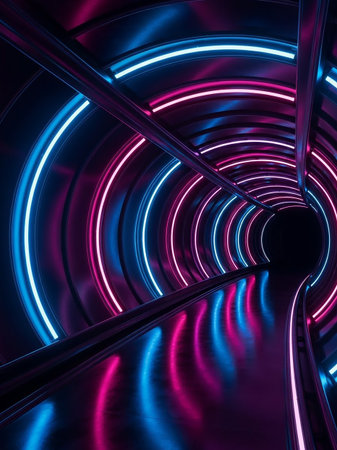A tunnel illuminated by neon lights running through the middle, casting a vibrant glow on the surroundings. The tunnel stretches ahead, creating a futuristic and colorful pathway