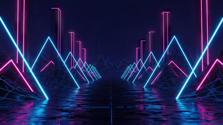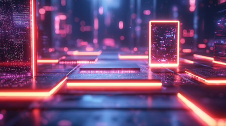 A vibrant digital landscape of neon grids and glowing patterns, creating an immersive futuristic cyber environment.