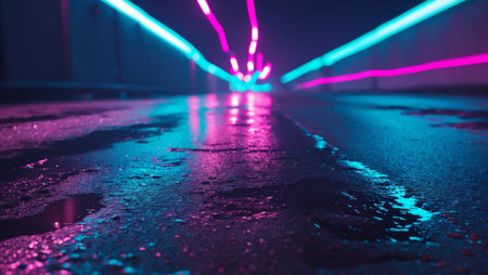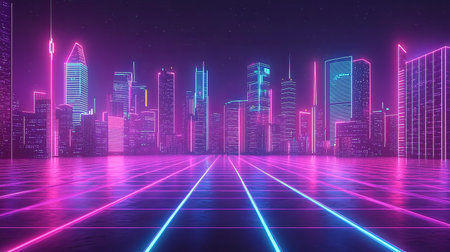 This stunning image features a futuristic cityscape at night, illuminated by vibrant neon lights. The glowing reflections create a surreal and imaginative atmosphere.
