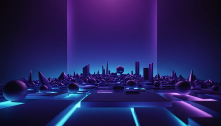 This image presents a futuristic design with various neon-colored shapes arranged on a grid. The composition showcases geometric forms such as circles, squares and a crescent. The scene is illuminated with a dark, ambient glow. Suitable for conceptual illustrations or designs related to technology, design, and digital art.
