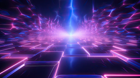 This image showcases a grid of dark squares illuminated by vibrant blue and pink neon light. The composition features a perspective view, highlighting the geometric pattern. The style is modern, with a focus on color and texture, suitable for various design projects and digital art applications.