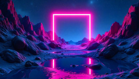 Neon Portal Landscape with Mountains, Lake and Starry Sky