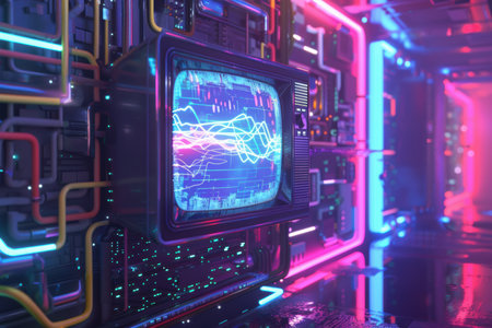 Retro Futuristic Floating TV with Colorful Static in Neon Circuit Room for Sci-Fi Design