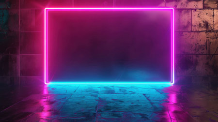 Neon frame with glowing blue and pink lights in a dark, reflective environment