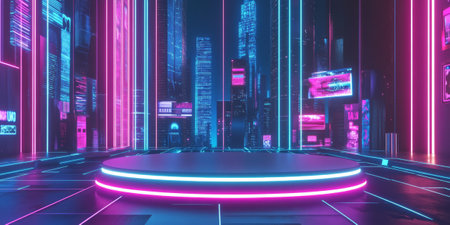 A neon cyber grid 3D background featuring a high-tech podium glowing with bright blue and pink neon lines. The futuristic cityscape in the background, with towering skyscrapers and digital billboards, adds to the sci-fi aesthetic.