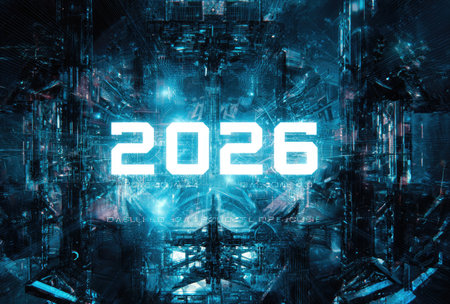An illuminated numerical inscription reading 2026 appears set against a complex digital network. The image exhibits a color palette of blues and whites, with a glowing effect suggesting an advanced technological environment. This visually dynamic artwork could be useful for commercial and editorial purposes related to technology, future concepts, or digital design.