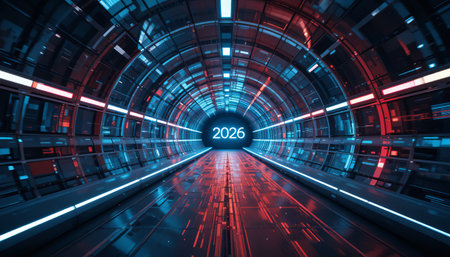 a futuristic tunnel with glowing lights and the year two thousand twenty six at the end