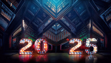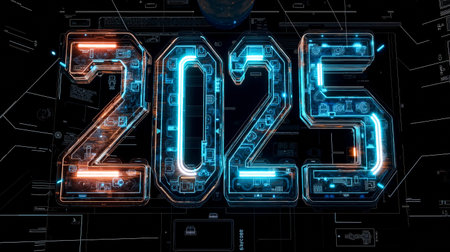 A digital artwork featuring the number 2025 in a futuristic illuminated font surrounded by intricate circuit-like designs and blue lighting effects