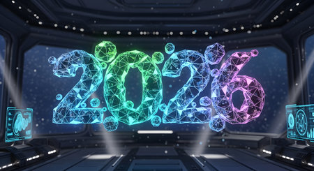 Sparkling crystal numbers for 2026 gleam in a sleek, modern futuristic setting, perfect for New Year's celebrations, business projections, or forward-thinking concepts.