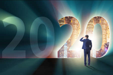A striking representation of the year 2020 with illuminated numbers against a futuristic skyline, capturing the essence of innovation and change in a vibrant urban landscape.