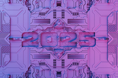 3d illustration Futuristic tech postcard with the year 2025 on the background of a metallic, technological cover of a spaceship or robot. Abstract graphics in the style of computer games.
