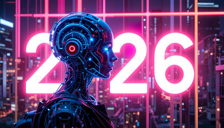 Bright pink neon year 2026 glows against a dark, futuristic city.
