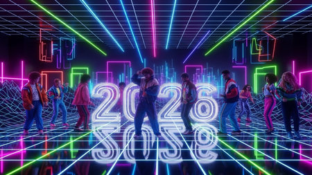 A vibrant digital display showcasing the year 2026 in a futuristic setting, illuminated with colorful lights and stage elements.