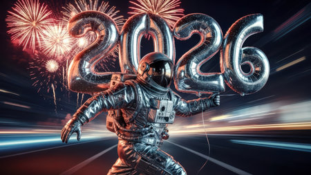Astronaut in Motion Gripping '2026' Balloon Under Fireworks.
