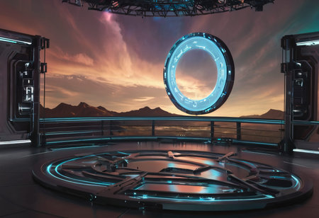 Inside spaceship laboratory interior architecture and empty podium for cyberpunk product presentation. Technology and Sci-fi concept.