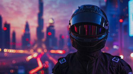 A futuristic racer donning a sleek, advanced helmet stands confidently against a vibrant neon cityscape at dusk