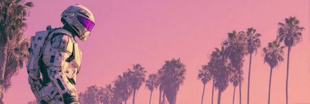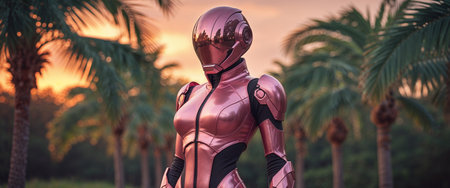 AI Generated. Pink Metallic Helmet and Suit Futuristic Female Figure in Palm Tree Grove at Sunset