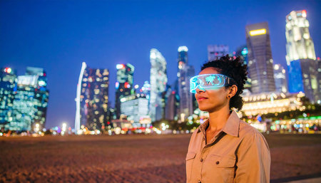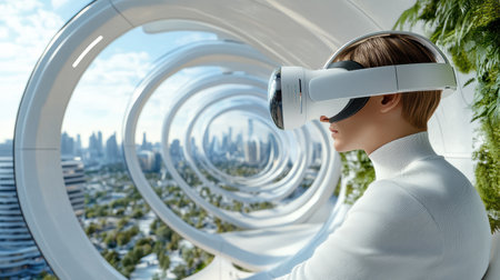 A person wearing virtual reality goggles in futuristic setting, surrounded by modern cityscape
