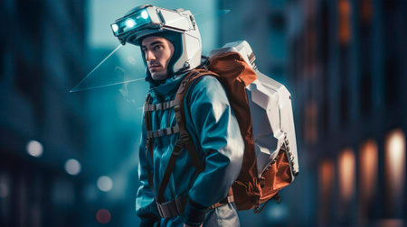 Handsome jet pack man courier messenger is ready to fly. Delivering online orders, purchases, goods, packages in the city. Male guy employee wears jet suit works in the express flying shipping. Innovation invention start up business concept. Transportation in the future.