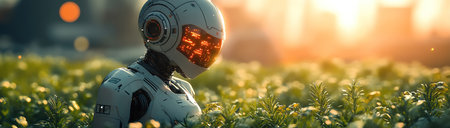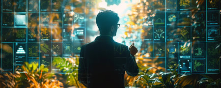 A modern farmer wearing a VR headset in an open field, symbolizing the integration of agro-tech in sustainable farming. Surrounded by young plants. Copy space banner.