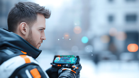 A man with a beard and short hair, wearing a dark jacket with orange accents, holds a sophisticated device featuring a vibrant digital screen displaying data.
