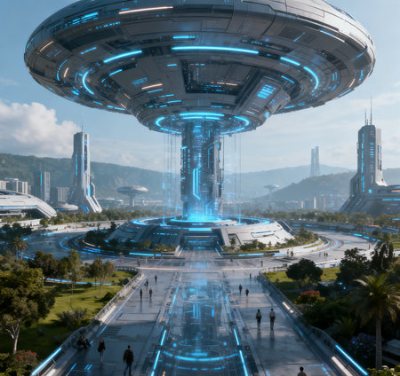A vibrant cityscape showcases robots and humanoids amidst holographic displays. The artwork features a futuristic aesthetic with neon lines, digital interfaces, and architectural elements. The lighting emphasizes the technological theme, hinting at innovation. Suitable for various applications, including editorial and commercial design projects.