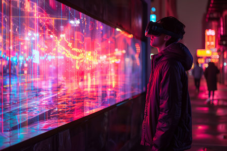Man Wearing VR Headset Stands Before Neon Cityscape at Night