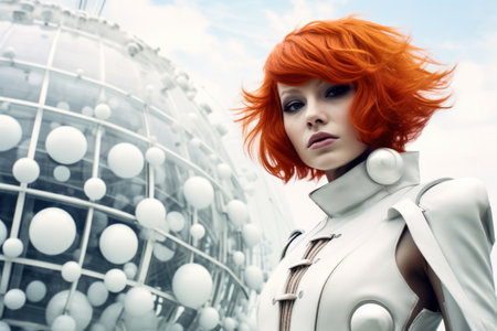 Young redhead woman with a futuristic architecture background. Generative AI.