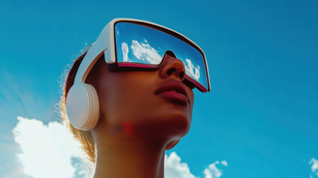 Reflective visor headphones shine brightly as a woman poses against a vibrant blue sky, exuding bold futuristic vibes.