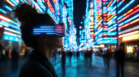 Woman wearing virtual reality goggles in Hong Kong at night, China.