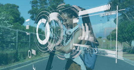 Round scanner and data processing against african american woman using smartwatch. digital interface and technology concept