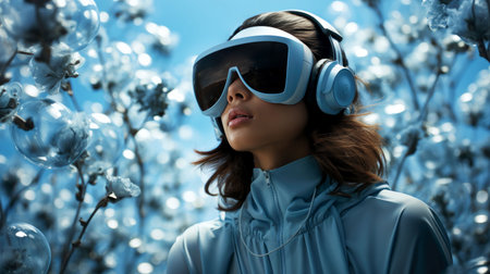 Portrait of a beautiful asian woman wearing virtual reality glasses outdoors