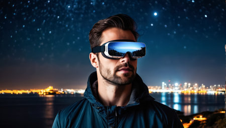 Young male experiencing virtual reality with futuristic headset by night cityscape