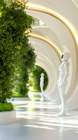 Futuristic robots stand in a modern white corridor with curved walls illuminated by natural light. Green plants add a touch of nature, creating a blend of technology and nature.