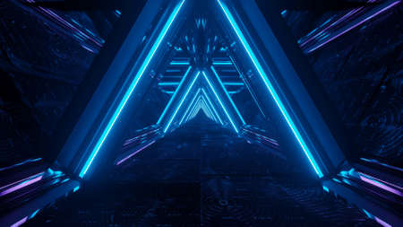 Neon Glowing Laser Blue Triangle Sci Fi Futuristic Technology Schematic Motherboard Matrix Chip Reflective Gate Portal Vibrant Tunnel Corridor Background 3D Rendering Illustration