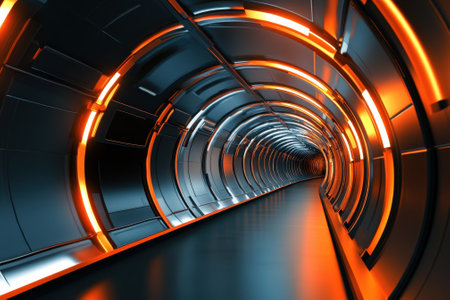 A long, dark tunnel features vibrant orange lighting and smooth metallic surfaces, creating a sci-fi atmosphere.