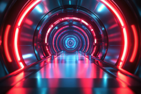A sleek, circular tunnel features glowing red and blue lights, creating a dynamic atmosphere in the distance.