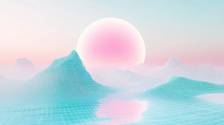Glowing sun floating over retro futuristic wireframe landscape