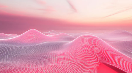 Abstract digital landscape featuring glowing wireframe waves under a pink sky