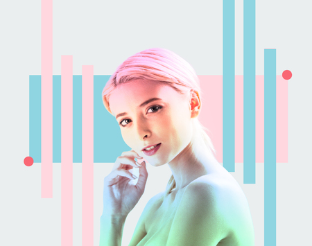 A portrait of a dark-haired lady. Modern fashion, beauty and style. Technologies, robots, artificial intelligence.