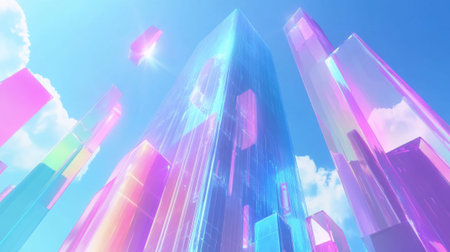 Modern glass skyscraper with vibrant rainbow colors reflecting sunlight in futuristic cityscape. concept of urban architecture, colorful design, urban innovation.