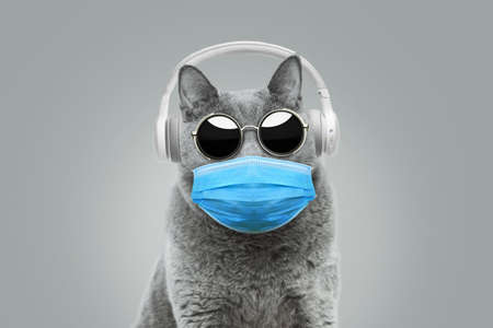 funny hipster cat with sunglasses in a medical mask listens to music with white headphones. Creative idea of virus protection