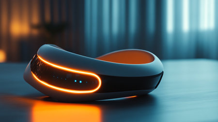 A dog relaxes inside a futuristic, high-tech pet house, showcasing modern design and technology.