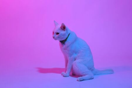 The white cat in the color gel light,