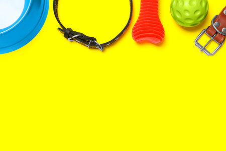 Flat lay composition with dog collar and toys on yellow background. Space for text