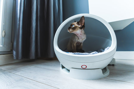 Devon Rex cat on a smart bed with thermoregulation. High quality photo