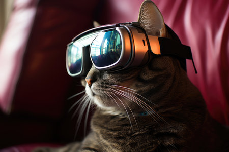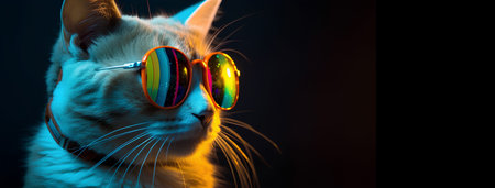 Cat wearing virtual reality headset against a colorful neon background. Concept of modern technology, animal humor, futuristic entertainment.