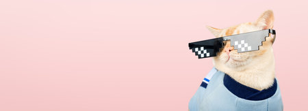 Stylish Burmese cat in trendy pixel glasses on a pink background. Copy space.