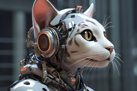 cool robot cat with robotic leg in white paws, generative ai