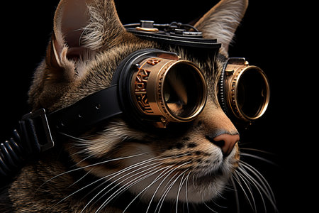 Black cat wearing VR headset in a colorful starry galaxy. Concept of virtual reality, space exploration, futuristic technology, digital world, funny pet.